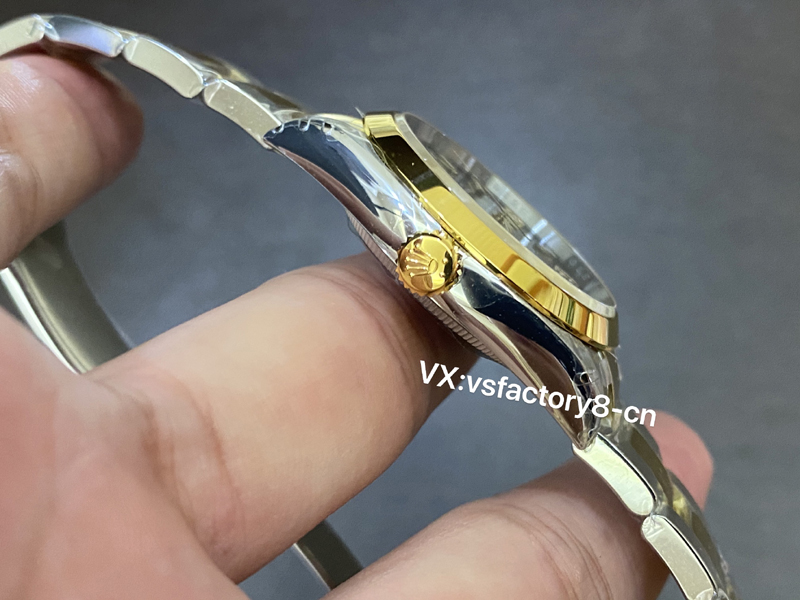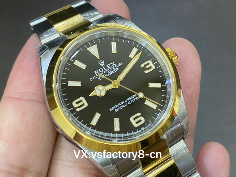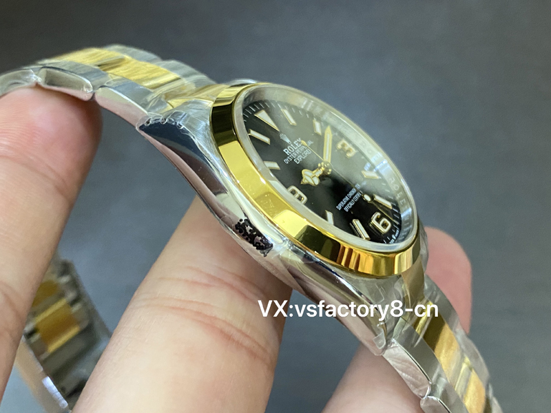 VS厂复刻表劳力士间金探险家采用904L精钢钢与真空电镀18K斤材质,其中外圈、表冠与表带中间链节采用18K金真空电镀打造而成。