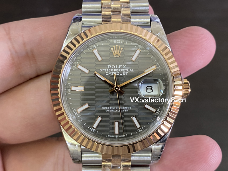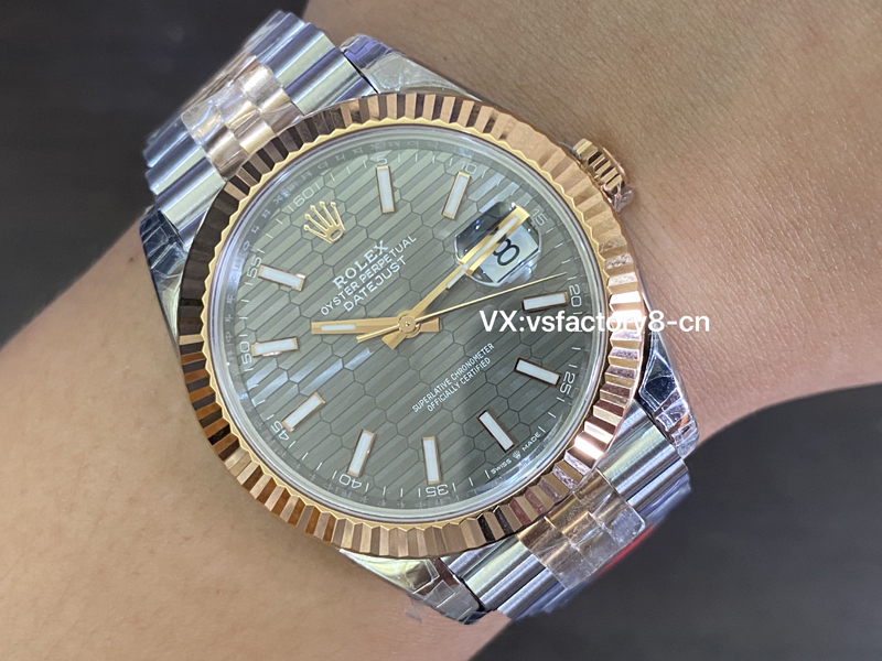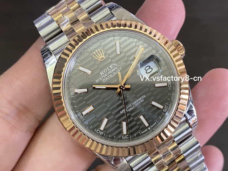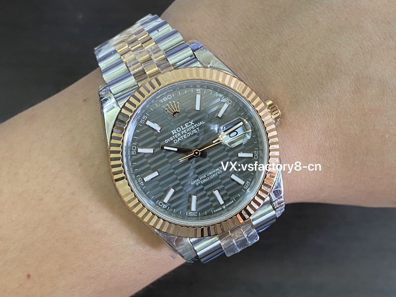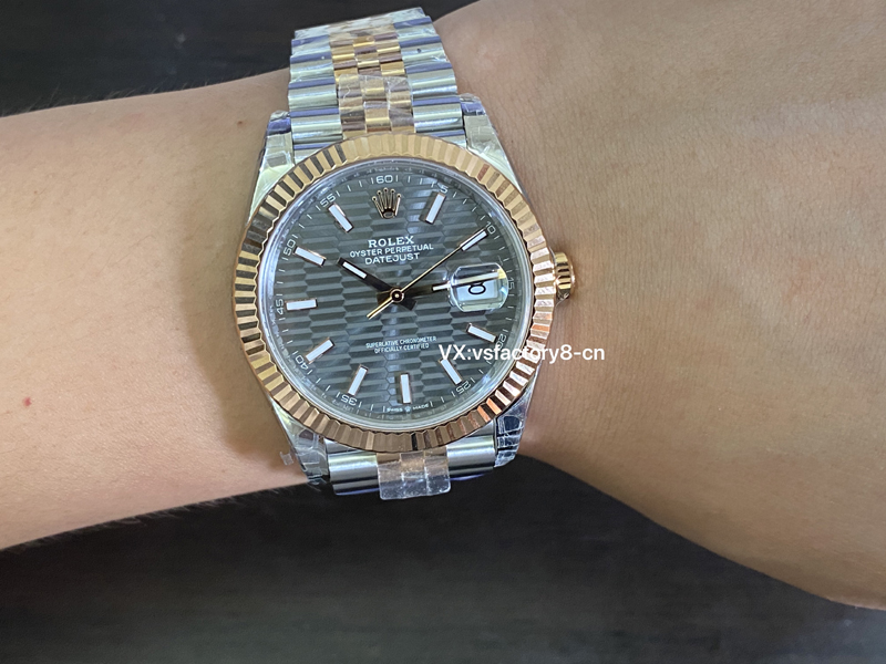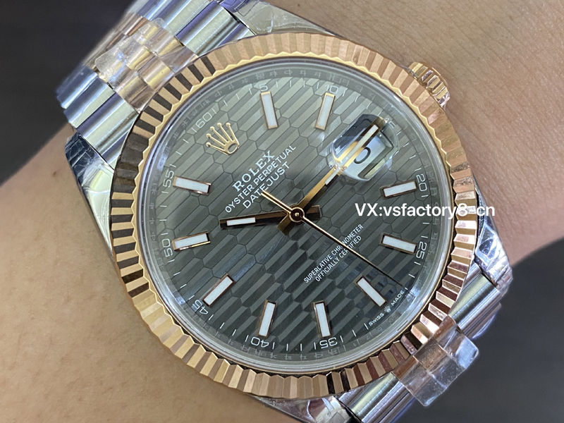 VS厂劳力士41m间玫瑰金石板灰水纹面日志搭载丹东一体3225机芯,唯一72动能储存版本。而且质量稳定,几乎不用返修售后。