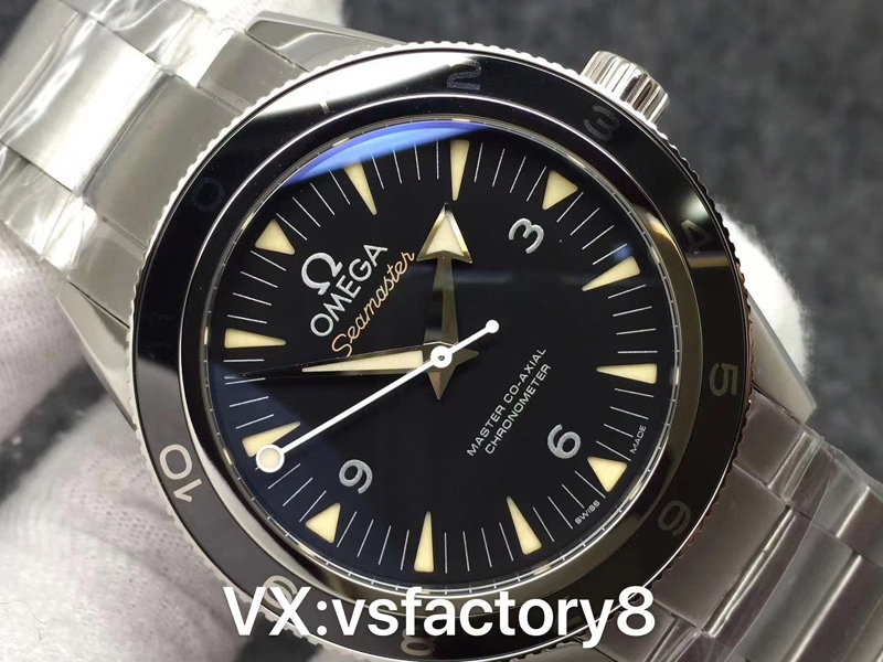 VS厂欧米茄海马150米幽灵党007的表盘细节做工非常高超,采取了原版一致黑色盘面还原,时标刻度经过正版一致镂空切割,最醒目的还是复刻还原了正品一样采取了棒棒糖秒针还原,让此款复刻表非常醒目,3,6,9搭载了阿拉伯数字,表盘上的时标和指针采用了精致的激光打印工艺,字迹清晰,颜色对比鲜明,经久耐用。即便是在恶劣的光照条件下,读时数字依然清晰易读,均填充了瑞士夜光粉涂层,做到了原版一致细节做工,非常值得入手。