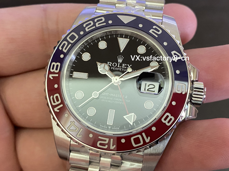 VS厂劳力士可乐圈复刻表V3版核心之处就是表圈了,VS工厂入了原版开模开版,研发烧制一体蓝红陶瓷表圈,俗称“可乐圈”称号,值得一提的是表圈经过紫光灯照射,能呈现出全红的陶瓷圈,做到了原版一致细节做工,表圈上清晰的刻度和小时标记,还原了正版一致工艺,并且按照最新版2022年版本复刻一致,此外,表镜搭载了最高品质蓝宝石水晶玻璃材质,内镜进行了镀膜和防眩晕工艺,六点位置镜面隐形防伪标志小皇冠完美复刻到位,几乎呈现正品的品质和细节做工。