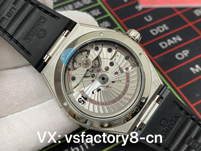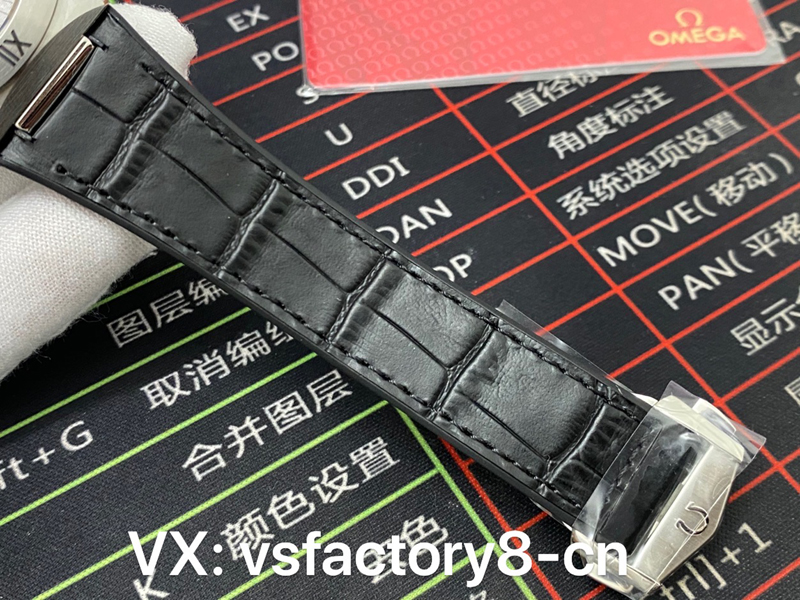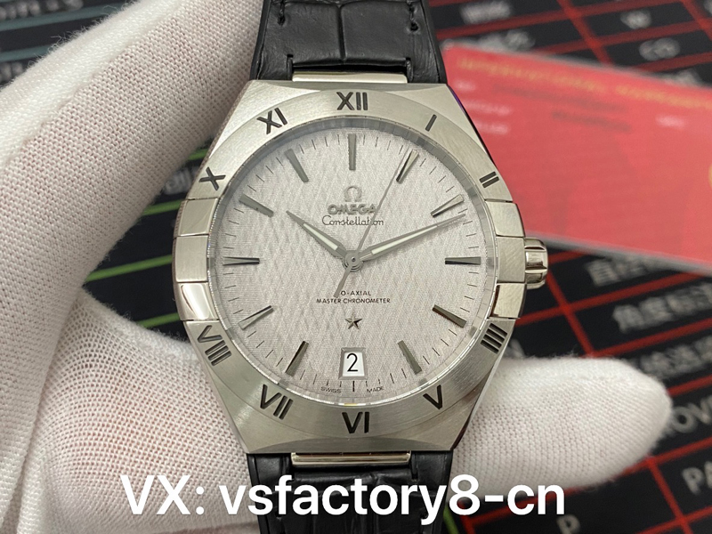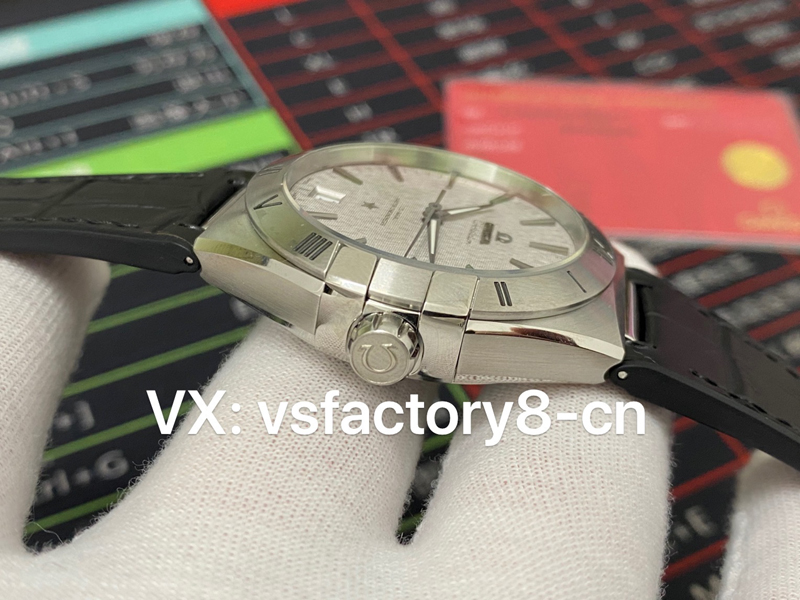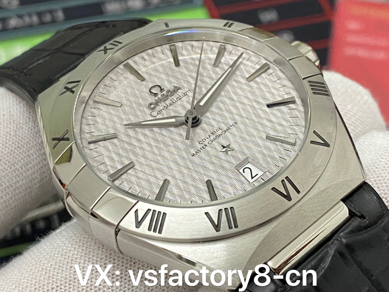VS厂欧米茄星精钢圈缎纹面星座指针、欧米茄品跑标识、星徽标识以及拱形小时刻度均经过黑化处理、盘面丝缎压纹铑灰色表盘,不同角度看,不一样的感觉。