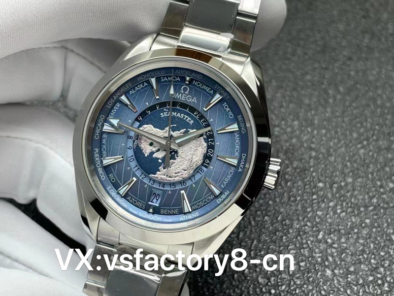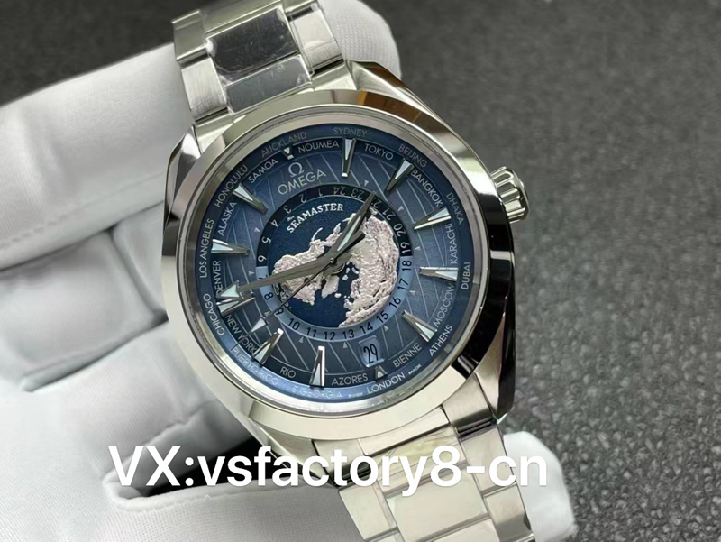 VS厂新款欧米茄世界时海马150米复刻表在色彩的演绎上,运用了渐变的Summer Blue色调,盘面颜色比之前的蓝盘世界时稍浅,通过渐变处理逼真地再现了海洋围绕陆地的浩瀚场景。