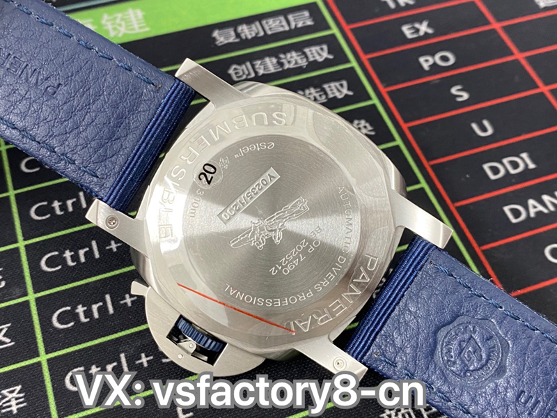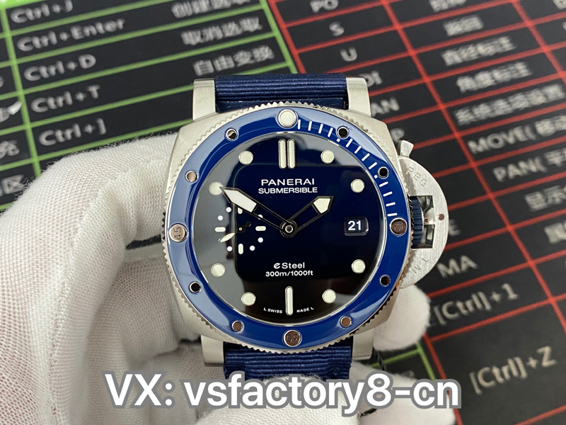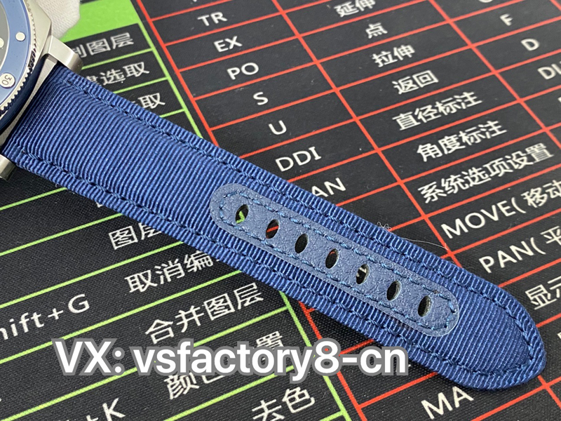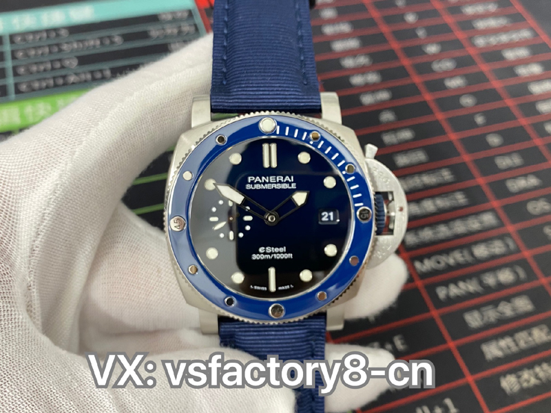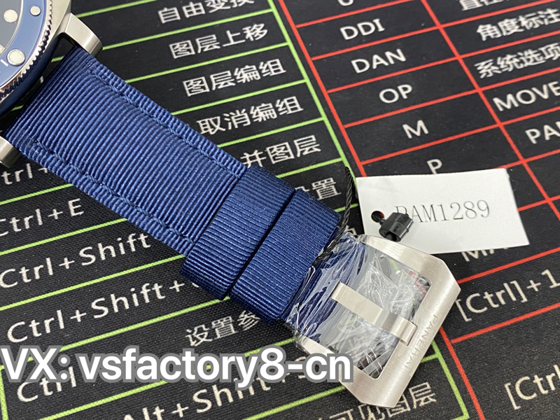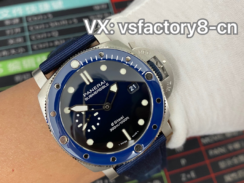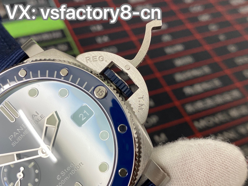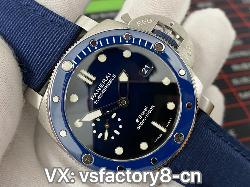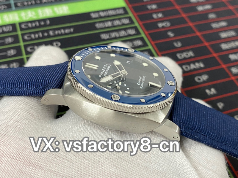 VS厂沛纳海1289采用磨砂eSteel™与抛光陶瓷材质的单项旋转圈饰有刻度标识,夜光棒状及圆点时标。